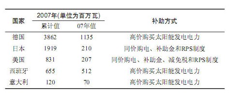 在太陽能發電上領先的歐洲,主要采用電力公司以高于普通電力的價格購買太陽能發電系統所發的電力。而美國和日本則采用與普通電力相同的價格購買太陽能發電系統所發的電力。美、日還補助用戶購置太陽能發電系統。下表列出了幾個先進國家的太陽能發電的發電量(單位為百萬瓦)和補助措施。