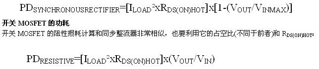 其中,RDS(ON)SPEC是計算所用的MOSFET導通電阻,TSPEC是規定RDS(ON)SPEC時的溫度。利用計算出的RDS(ON)HOT,可以確定同步整流器和開關MOSFET的功率消耗,具體做法如下所述。