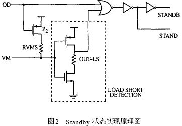 圖中信號OD 由數(shù)字電路產(chǎn)生, 當(dāng)比較器檢測到電池電壓低于過放電檢測電壓, 并經(jīng)過延時后,OD 將從高電平變?yōu)榈碗娖? 此時通過P2 管將VM拉到高電平, 再經(jīng)反相后從負載短路輸出OUT_L S端輸出低電平, 使輸出端STAND 變?yōu)榈碗娖?STANDB 為高電平, 意味著系統(tǒng)可以進入Standby狀態(tài); 一旦電池充電開始時,VM 端迅速被置為低電平, 此時不管OD 如何, 都通過OUT _LS 將STAND恢復(fù)為高電平, 系統(tǒng)進入正常的檢測狀態(tài)。
