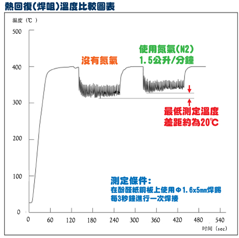下圖表示當焊咀前端吹出氮氣和沒有使用氮氣時,焊咀溫度變化的比較。由此可以證明在使用熱氮氣的情況下,如果要把焊點提升到相同的溫度,焊咀便能夠設定較低的溫度進行焊接。