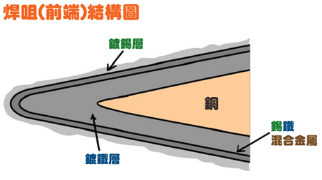 一般焊咀結構,內部主要由銅制成,外面會鍍上鐵(鍍鐵層),而鍍鐵層前端會鍍上錫(鍍錫層),后端則會鍍上抗氧化的鉻。由于錫和鐵同樣屬于高活動性的金屬,所以他們很容易會結合成混合金屬,特別是在高溫的狀態下。而且在焊接時所使用的助焊劑(特別是高活性的)亦是加速他們產生混合金屬反應的催化劑。
