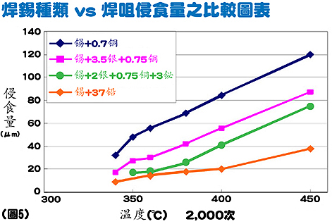 相比起傳統的共晶焊錫(63/37焊錫),在400℃的焊接溫度下,無鉛焊錫 錫+3.5銀+0.7銅 對焊咀的侵蝕速度要快3倍,而 錫+0.7銅更加要快4倍。