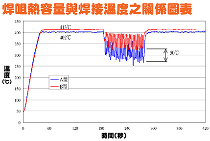 答案是B型。由于B型焊咀比A型咀焊粗(銅的部份),所以B型比A型的熱容量也較大和導熱性較快。雖然兩支焊咀形狀一樣(尖端部份),但B型咀身比較粗,焊咀越粗,銅的部份越大,保持溫度穩定的能力也越大。(請參考以下圖表)