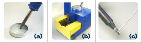 白光FT-700提供方便及快捷的方法來清潔焊咀上的氧化物。只要把焊咀插入特制的不含鉛凡士林化學膏內(a)(FT-700附帶),再使用FT-700的自動旋轉清潔刷來清潔(b),便可以有效去除焊咀上的氧化物。清潔后必需要再涂上新錫以保護焊咀鍍錫層(c)。