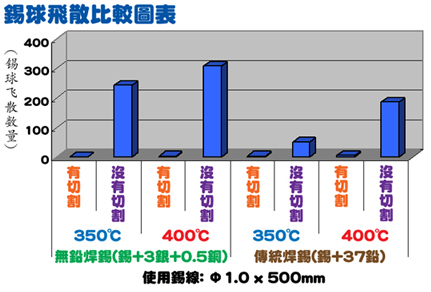 白光375 V-Cut 自動出錫機能夠把含助焊劑的錫線切割V形溝,防止錫線里的助焊劑因膨脹而造成飛散。這個創新的方法明顯能夠減少焊錫及助焊劑飛散,并同時改善焊錫的擴散性。 (請參考以下圖表)