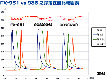 圖6顯示FX-951的焊點溫度最高,在連續焊接過程中,溫度仍然保持穩定。而907的溫度跌幅比較908的大,因為907的熱容量比較908的小。焊接溫度會根據焊點的大小而有所不同,如果焊點面積較小,使用907焊接也可以達到滿意的焊接效果。但根據圖6所示,FX-951的回熱速度明顯是最快的,能夠把電路板上每個焊點都提升到合適的焊接溫度。