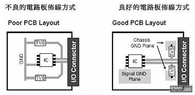 (圖一) TVS二極管的箝位效能可以透過將元件安排在接近輸出入連接點,并將連接TVS的走線長度縮短而提高。