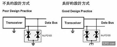 如果可能,保護線路應該將突波電壓并聯到參考點或者是機殼的接地上,如(圖二)所示。將突波電壓直接并聯到晶片的信號接地點會造成接地彈跳現象,在單一接地的印刷電路板上,TVS二極管的箝位效能可以透過利用相對較短且幅度較寬的接地走線將阻抗降到最低來加以改善。