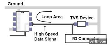 幅射噪音與受射頻信號影響的問題可以透過盡可能縮減由高速資料與接地線所形成的迴路區大小來降低,一個解決迴路區最小化問題的有效方法是在印刷電路板設計上加入接地面,特別是在走線長度相對較長時,雖然將TVS元件與晶片間的距離盡量加大可以提供隔離,但卻可能增加回路區的面積大小,請參考(圖三)。