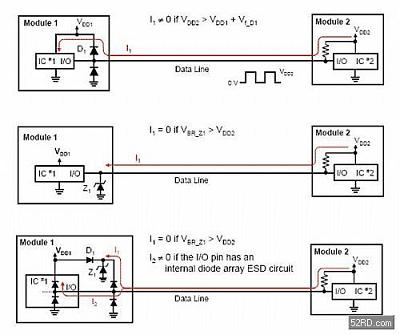 突崩式TVS二極管雖然擁有高突波規格,但相對較大的電容值使得這類元件成為負載切換開關與直流電源匯流排保護應用的較佳選擇,相反地,二極管陣列適當的突波規格與較小的電容值則較適用于高速資料連接線的保護,突崩式TVS與二極管陣列通常可以交互使用,但部份電路在選擇適合採用的元件時則需要經過仔細的分析。(圖四)描述了當存在一個電流可以透過資料線流經二極管陣列路徑時所發生的向后驅動問題,如果VDD2大于VDD1,那么資料連接線有可能意外地提供電源給模組1,這個情況可能會造成邏輯晶片的電源啟動問題,或是在斷電后模組1上指示燈被點亮的異常狀況。