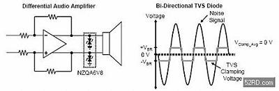 (圖五) 雙向式元件可以將噪音信號嵌位到0V的平均電壓,降低音頻放大器中的交流哼聲與直流雜音。