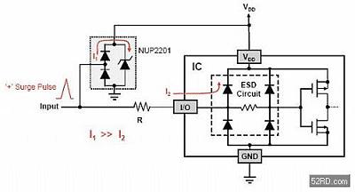 (圖六) 電阻R會促使I1>>I2,確保大部分的突波能量會由外部二極管所吸收。