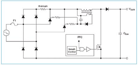 圖 3 顯示了為克服 NTC 中許多惱人問題的實(shí)施方案。這種實(shí)施方案就是既可選擇固定阻值的電阻,也可選擇 NTC 作為浪涌電阻。這里所闡述的浪涌電路具有兩只額外的硅控整流器 (SCR) 和一個(gè)來自 PFC 升壓電感小輔助繞組的非穩(wěn)壓電壓源。