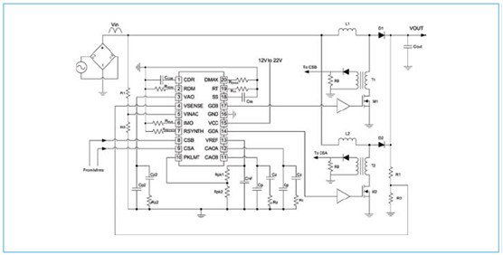 圖 3 顯示了業(yè)界首款單芯雙相交錯(cuò)式 PFC 預(yù)調(diào)節(jié)器——TI UCC28070 的簡化原理圖。交錯(cuò)雙相相互之間的相位差為 180°,這樣則消除了波紋電流,從而可以使用更小的電磁干擾 (EMI) 濾波器以及外觀更小巧的 PFC 輸出電容器。雙相交錯(cuò)式拓?fù)浣Y(jié)構(gòu)、體積更小的元件是嵌入式馬達(dá)驅(qū)動電路的理想解決方案。交錯(cuò)式 PFC 可滿足非常高的功率密度要求。