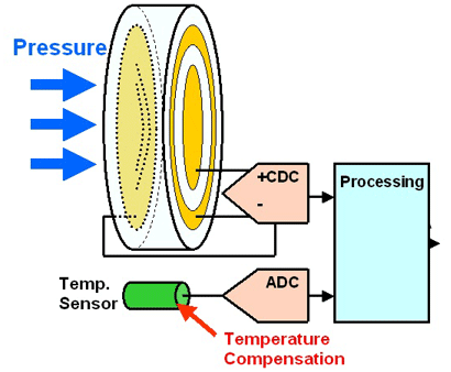 由于熱擴散,溫度傳感器需要考慮改變的幾何形狀。設想兩個電極中的一個附著在芯片上,另一個附著在由金屬或陶瓷構成的支架上,因此支架自己作為傳感器。以陶瓷為例,能夠承受非常高的壓力和侵入的媒介。與經典的惠斯通電橋相比較,電容壓力傳感器的主要優點是對輸入電流的要求更低,使得他們特別適合于諸如輪胎壓力控制之類的應用。