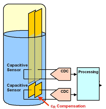 在一個液位傳感器中,一對固定的導板浸沒在要測量的液體中。制造商能夠以非常低的成本制造出印制導體。第二對導板附著在底部,可以檢測出由于溫度或其他影響導致的電介質變化,如下圖所示。