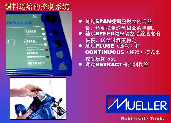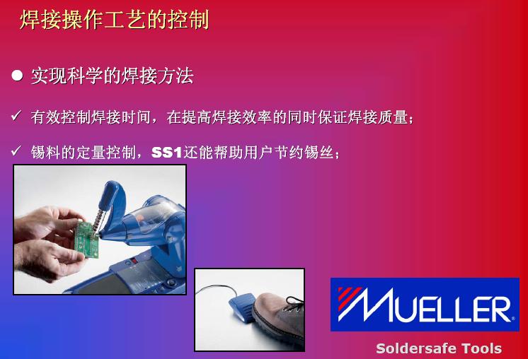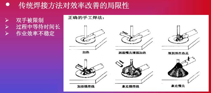 在發熱功率方面的提高,我們碰到另外一個問題。我們也可以看到951和937,還有新推出來機器,我們將發熱功率進行對比。他們也花了很多研發精力來提高發熱功率,如果在提高發熱功率之后,確實能提高生產效率,但是它是不是可以被無限制提升呢?現在的機器比如到150瓦到160瓦,已經上升了3倍,是否還會提高到4倍,這一個效率的提高導致整體效率的提高,我個人不是很贊同。其實這是比較系統性的解決方案,我們看到MUELLER是通過對工藝改進達到更高的焊接效率。在談到這款機器之前,我們回顧一下傳統焊接方法作業的特點,我們的圖從左到右看,整個工藝從加熱到預熱,再繼續加熱,第四步是添加焊心,然后取走焊嘴,這是非常傳統的焊接工藝,反過來看,我們看到整個焊接過程中,雙手是被限制的。從第二張圖開始,都是靠手去拿,關鍵是控制在雙手被占用。過程等待時間會很長,我們可以看到實際作業過程中下面三步是真正起到作用,前面預熱當然是準備工作,但是在這個工作中,我們雙手等待的時間會非常長。第三個,作業效率不是特別穩定,因為我們送錫的時候,以及拿走錫絲過程中依賴員工本身的技巧和技術。