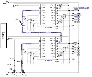 如果8節電池中的某一節電池發生過放電時,則由與該電池相連接的S-8204B的DOP端子向另一個S-8204B芯片的CTLD端子發出過放信號,改變其DOP端子的狀態,最終使得放電控制用MOSFET關斷,結束放電。圖2給出了采用兩個S-8204B實現過充電保護的電路工作原理圖(在N溝道MOSFET控制情況下),圖3是過放電保護工作原理圖。