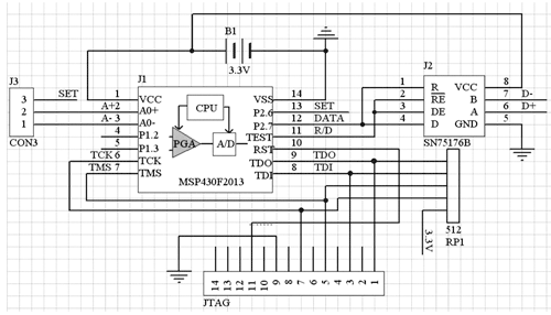 本文介紹的單片傳感信號接口設計采用了德州儀器公司新近推出的一款多功能的微控制器MSP430F2013,它內部集成了16位的Σ-ΔADC。2kb的程序空間和128b的數據存儲空間,可以完成數據的智能采集,并采用差分傳輸方式進行數據的傳輸。數據按幀進行傳輸,傳輸過程中采用CRC檢驗進行差錯控制。