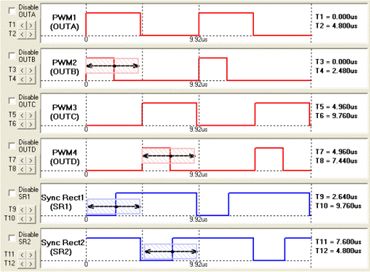 因此,為最大限度地提高效率,要求死區(qū)時(shí)間盡可能小。但是在傳統(tǒng)的模擬方案中,自驅(qū)動(dòng)型除了應(yīng)用的限制外,還很難提供精確的控制時(shí)序;對(duì)于外驅(qū)動(dòng)型,由于其參數(shù)是由電阻、電容等無(wú)源器件進(jìn)行設(shè)定,存在誤差、老化、溫漂等問(wèn)題,為保證有足夠的余量,死區(qū)時(shí)間也不可能設(shè)置得很小。因此,ADP1043的數(shù)字方案是很好的選擇。圖2所示為ADP1043在全橋拓?fù)潆娐废碌腜WM和SR的GUI設(shè)置界面。通過(guò)設(shè)置T9、T10、T11和T125便可精確獲得同步整流MOSFET所需的死區(qū)時(shí)間,其中每次調(diào)整的最小時(shí)間為5ns。
