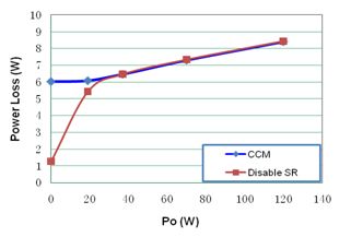 通過(guò)ADP1043的GUI可以設(shè)置關(guān)閉同步整流時(shí)的電流閾值。當(dāng)輸出電流值低于該閾值時(shí),關(guān)閉同步整流。如圖6所示為采用ADP1043設(shè)計(jì)的全橋拓?fù)涞哪K電源在不關(guān)閉和關(guān)閉同步整流在輕載條件下的損耗的情況。可以看到,當(dāng)關(guān)閉同步整流后,大大減少了電源的輕載損耗。
