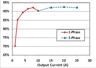 但是,隨著負(fù)載的減少,電路進(jìn)入輕載狀態(tài),開關(guān)管的開關(guān)損耗逐漸占主導(dǎo),此時(shí),輸出由一相供電就已經(jīng)足夠,多相的并聯(lián)反而使開關(guān)損耗成倍增加。因而,在輕載時(shí),僅留一相工作,關(guān)閉多相模式,可以明顯改善電路在輕載時(shí)的效率。如圖7所示,為采用ADP1043所設(shè)計(jì)的交錯(cuò)式雙管正激電路。當(dāng)輸出電流值低于通過(guò)GUI所設(shè)置的閾值時(shí),ADP1043便會(huì)關(guān)閉QA2、QB2的驅(qū)動(dòng)信號(hào),以減少損耗。圖8所示為采用切相技術(shù)的電源的效率曲線,可以發(fā)現(xiàn)當(dāng)輸出電流低于10A時(shí),電源工作在單相模式下,效率有了明顯的提高。
