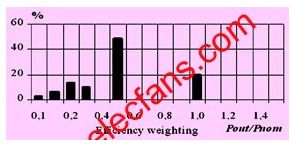 對于傳統電力電子裝置的設計,我們通常是通過每千瓦多少錢來衡量其性價比的。但是對于光伏逆變器的設計而言,對最大功率的追求僅僅是處于第二位的,歐洲效率的最大化才是最重要的。因為對于光伏逆變器而言,不僅最大輸出功率的增加可以轉化為經濟效益,歐洲效率的提高同樣可以,而且更加明顯。歐洲效率的定義不同于我們通常所說的平均效率或者最高效率。它充分考慮了太陽光強度的變化,更加準確地描述了光伏逆變器的性能。歐洲效率是由不同負載情況下的效率按照不同比重累加得到的,其中半載的效率占其最大組成部分(見圖1)。