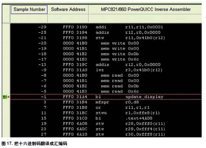 在使用處理器時,特定的十六進制字符包含一個處理器指令。如果您很熟悉十六進制代碼,就能查看這些類似圖13 所示的十六進制代碼表,并知道它們代表的指令。但我們大部分人做不到這一點。因此,絕大多數分析儀制造商設計了稱為反匯編器的軟件包。這些軟件包把十六進制代碼轉換成易于閱讀的匯編碼。例如圖13中有0000 41B0 和0000 41B1。我們可以從MotorolaPowerQUICC 手冊中查到它們代表存儲器寫0x00 指令。反匯編器可以為我們做這些事情,使我們不需要查找這些代碼。請查看圖17 并注意它們之間的差別。
