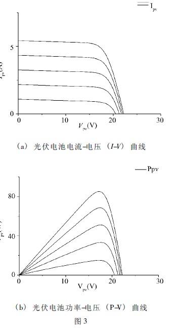 圖3a為光伏電池在不同光照下的電流-電壓(I-V)曲線,圖3b為光伏電池在不同光照下功率-電壓(P-V)曲線。如圖3.b所示,在一定的光照情況和節點溫度下,光伏電池有唯一的發電最大功率點,因此需要光伏控制器進行最大功率跟蹤(MPPT)控制以獲得最大發電效率。