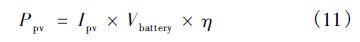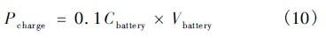 式(8)(9)中I為負載所需電流,T為負載每日工作小時數。Ta為平均日照時間。t為連續雨天數,Ksafe為安全系數,Ksoc為蓄電池容許放電深度,η為變換器效率。按三段式10小時充電法,在恒流充電階段,充電電流icharge為0.1Cbattery。則恒流充電階段,充電功率為: