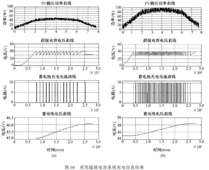 在陰天弱光照情況下,超級電容充放電次數較少,蓄電池電壓呈階梯狀上升。在晴天強光照下,超級電容充放電次數多。