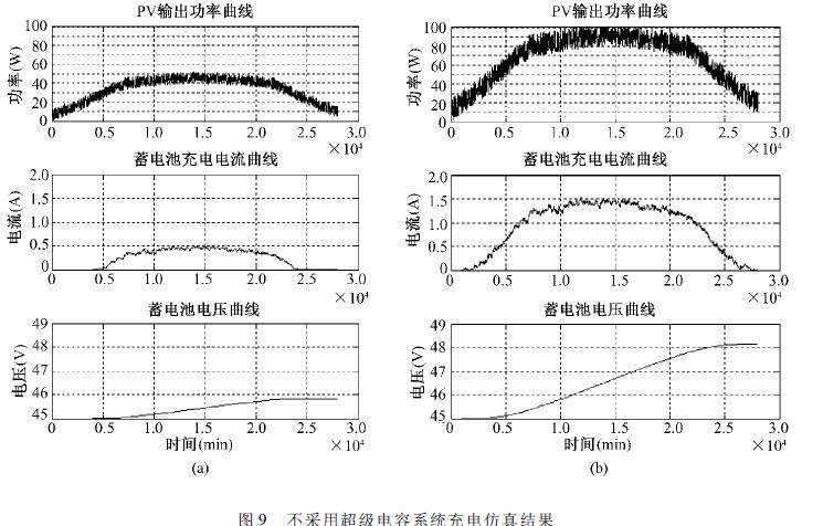 對比兩種系統結構,從蓄電池最終電壓可以看出,弱光照情況下,使用超級電容系統的光伏電池的利用率上升,蓄電池電壓變化值約為不采用超級電容的蓄電池電壓變化值的120%,即在弱光照下,系統的光伏發電效率提高了大約20%。而在晴天,有足夠光照的情況下,雖然在早晚光照較弱時,其發電能力得到提高,但由于多引入一級變換器,在較高功率下,采用超級電容沒有對系統的發電效率有明顯的提高。由上,采用超級電容的獨立光伏系統在光照不足的地區能對發電能力有明顯的改善。