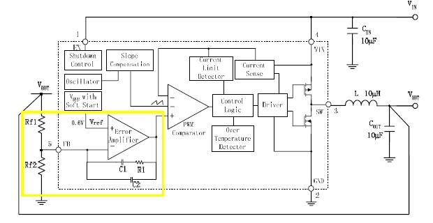 反饋電阻Rf1和Rf2的第一個作用是設置Buck電路的輸出電壓值,如圖2所示,穩態時,運算放大器的反相輸入端和同相輸入端電壓是相等的,于是可以得到輸出電壓計算公式:,其中VREF是芯片內部基準電壓(本例中為0.6V)。