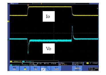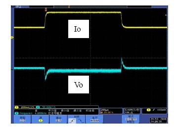 系統的帶寬是影響系統動態響應的重要因素,相位裕度是影響系統穩定性的重要因素。如果選擇不同的Rf1,系統的帶寬和相位裕度會產生變化,也就是動態響應和穩定性會發生變化。具體以表1來分析,當Rf1從300k變到750k,系統地帶寬從51.1kHz變到26.1kHz,因此系統的動態響應會相應的變差,而由于相位裕度都是足夠的,因此系統都處于穩定工作的狀態。圖7和圖8是做負載切換的動態響應測試結果,從測試結果可以看出環路響應速度變慢,導致輸出電壓過沖變大,動態響應效果變差。