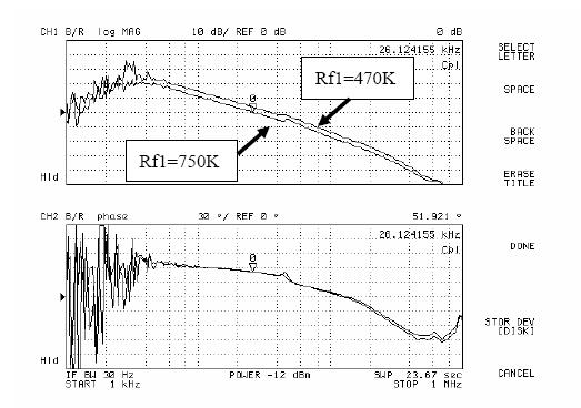 圖5和圖6是用網絡分析儀進行AP3406環路增益測試的結果。由圖可以看出,當Rf1從300k變化到470k,再變化到750k,系統的環路增益的幅頻特性不斷向下移動,同時相頻特性基本不變。于是系統的帶寬和相位裕度都有較大改變,測試結果如表1所示。