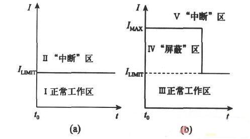 當(dāng)負(fù)載電流超過限制電流ILIMIT 不太多且持續(xù)作用時(shí)間不太長時(shí),我們希望過流保護(hù)電路能保持LDO 不中斷工作,因此需要采用“屏蔽”模式屏蔽掉部分可以讓LDO 不中斷運(yùn)行的過流信號,對于過流幅值和持續(xù)作用時(shí)間超過范圍的過流信號,過流保護(hù)電路又能采取中斷LDO 工作的模式。傳統(tǒng)的“中斷”模式電流保護(hù)電路工作狀態(tài)如圖1(a)所示,分為正常工作區(qū)Ⅰ和“中斷”區(qū)Ⅱ,當(dāng)負(fù)載電流不超過ILIMIT 時(shí),LDO 工作在正常工作區(qū),當(dāng)負(fù)載電流超過ILIMIT 時(shí)LDO 進(jìn)入“中斷”區(qū)。加入“屏蔽”模式后的過流保護(hù)電路工作狀態(tài)如圖1(b),分為正常工作區(qū)Ⅲ、屏蔽區(qū)Ⅳ以及中斷區(qū)Ⅴ,當(dāng)負(fù)載電流小于ILIMIT 時(shí),LDO 處于正常工作區(qū),當(dāng)過流信號的幅值在ILIMIT 和最大幅值電流IMAX 之間,持續(xù)作用時(shí)間在t=tMAX 之內(nèi)即同時(shí)滿足ILIMIT ≤ ILOAD ≤ IMAX,t ≤tMAX 時(shí),LDO 進(jìn)入屏蔽區(qū),這個(gè)范圍之外的過流信號將進(jìn)入中斷區(qū)。對比圖1(a)和(b)可以看出,改進(jìn)過流保護(hù)電路后的LDO 的正常工作區(qū)包括圖1(b)的正常工作區(qū)Ⅲ和“屏蔽”區(qū)Ⅳ,增大了工作區(qū)的范圍,提高了LDO 的工作效率。