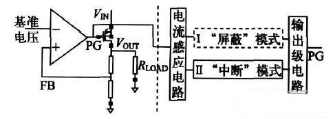 包含過流保護(hù)電路的LDO整體框圖如圖2所示,虛線左邊是LDO 主體電路,包括誤差放大器、功率管、負(fù)載電阻以及分壓電阻。虛線右邊部分為電流保護(hù)電路,主要作用是感應(yīng)并檢測負(fù)載電流是否超過限制電流,然后通過控制功率管來決定是否使LDO 中斷運(yùn)行,包括電流感應(yīng)電路和控制電路。傳統(tǒng)的過流保護(hù)電路只采用圖2 中實(shí)框Ⅱ所示的“中斷”模式(不包括虛框),對于任何負(fù)載過流情況,不論持續(xù)作用時(shí)間如何,都使LDO 中斷工作;本文在傳統(tǒng)的“中斷”模式基礎(chǔ)上,增加了“屏蔽”模式(如圖2 中虛框Ⅰ),能有效屏蔽希望LDO不中斷工作的過流信號,使LDO更高效運(yùn)行,同時(shí)保留“中斷”模式,保證LDO 安全工作。