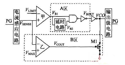 圖3 是改進(jìn)前后的過流保護(hù)電路圖。不加虛框部分是傳統(tǒng)的“中斷”模式過流保護(hù)電路,由電流感應(yīng)電路、比較電路以及輸出級電路組成。電流感應(yīng)電路采樣功率管電流。采樣得到的電流和限制電流ILIMIT 分別轉(zhuǎn)化為比較器的兩輸入端電壓VSENSE 和VLIMIT 并進(jìn)行比較,得到VCO。VCO作用于輸出級電路以控制功率管柵極電壓。如果負(fù)載過流,過流保護(hù)電路使得功率管柵極電壓PG 為高電平,強(qiáng)行使LDO中斷。