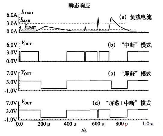 圖5(b)表示“中斷”模式在所有過流情況時(shí)都會關(guān)斷LDO。圖5(c)的“屏蔽”模式能屏蔽tMAX內(nèi)的過流信號,但同時(shí)也屏蔽了過流幅值超過IMAX的電流信號,只有在過流持續(xù)作用時(shí)間大于tMAX 時(shí),LDO 才被關(guān)斷。圖5(d)的“屏蔽+ 中斷”模式下,電路只在過流信號持續(xù)作用時(shí)間小于tMAX 而且幅值不超過IMAX 時(shí)屏蔽掉過流信號,對于其他超過ILIMIT的過流信號,都將中斷LDO 運(yùn)行。通過比較圖5 的(b)、(c)和(d)曲線可以得到,相對于圖5(b)的“中斷”模式,圖5(d)的“屏蔽+ 中斷”模式擴(kuò)大了工作區(qū)范圍,又比圖5(c)的“屏蔽”模式保護(hù)電路更安全。傳統(tǒng)屏蔽電路都會在過流之后關(guān)斷LDO,我們希望在某些短時(shí)且小幅度過流信號下LDO 仍能正常運(yùn)行。結(jié)果表明,設(shè)計(jì)后的過流保護(hù)電路能達(dá)到預(yù)期效果,保證系統(tǒng)更高效安全地運(yùn)行。
