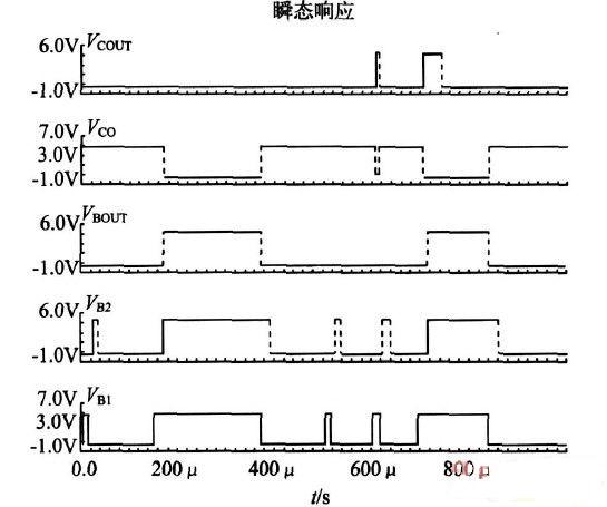 “屏蔽”模式的邏輯關(guān)系如圖4 所示,其中VB1和VCOUT 分別為比較器甲和乙的輸出信號,VB1 經(jīng)過一個(gè)延遲時(shí)間后輸出信號為VB2,屏蔽電路輸出電壓為VBOUT,VCO為屏蔽電路的輸出端。VB1、VB2和VBOUT的波形反應(yīng)了屏蔽電路的邏輯關(guān)系,只有當(dāng)VB1 和VB2 同時(shí)為高電平,VBOUT 才為低電平,否則VBOUT 一直為高電平,因此屏蔽電路屏蔽了延遲時(shí)間內(nèi)的脈沖信號,保持寬脈沖信號;VCOUT為使能端,只要VCOUT為高電平,VCO 立即變?yōu)榈碗娖健?/p>