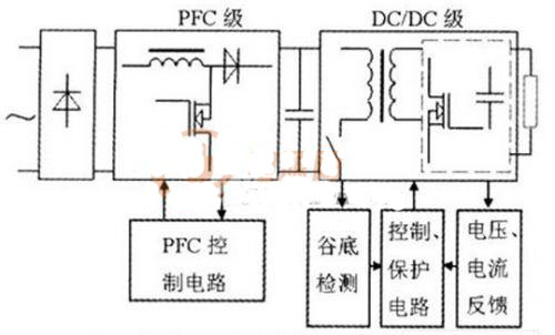 所研究的開關電源結構如圖1所示,采用兩級PFC結構,由PFC預變換器、隔離變換器和同步整流電路組成的DC/Dc變換器以及檢測與保護電路組成。交流電壓經(jīng)整流后先輸入到PFC預變換器進行功率因數(shù)校正變換,再由電源控制電路控制隔離變換器,將直流電壓轉換成高頻交流脈沖電壓,此脈沖電壓經(jīng)同步整流器整流、濾波電路濾波后,得到所需的直流。