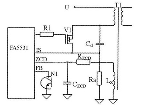 功率隔離變換器電路如圖5所示,由控制電路和反激式變換器組成。圖中,變壓器輔助繞組LZ、電阻RZCD、電容CzcD組成谷底探測電路,為控制芯片F(xiàn)A5531提供谷底檢測信號。光電耦合器N1次級將輸出電壓反饋信號輸入控制芯片。電路啟動后,F(xiàn)A5531輸出驅動信號使V1導通,V1電流上升,此電流由Rs檢測輸入到控制芯片的IS引腳,與由反饋輸入FB引腳的電壓決定的參考電壓進行比較,達到參考電壓時,V1關斷,變壓器繞組電壓反相,變壓器初級電感向次級負載饋送能量。當向次級饋送能量過程結束時,次級電流下降到零。變壓器漏感與開關管寄生電容Cd構成了諧振電路,變壓器輔助繞組感應此諧振電路的諧振電壓,并輸入到FA5531P的ZCD引腳。當次級電流下降到零時,諧振電路的諧振電壓迅速下降,輔助繞組的感應電壓也迅速下降,當ZCD引腳上的電壓降至谷底探測閾值時,F(xiàn)A5531P驅動輸出使V1重新導通。由于電阻RzcD、電容CzcD會引入延時,選擇合適的RzcD、CzcD值,就可實現(xiàn)V1零電壓開通。