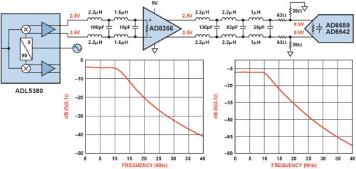與具有217 Ω差分輸入阻抗的AD8366接口時,ADL5380具有5.9 dB電壓增益和–0.5 dB功率增益[5.9 dB – 10log (217/50)]。為獲得最佳性能,將ADL5380 ADJ引腳連接至VS,使ADL5380與AD8366間的共模電壓設置為2.5 V。在ADL5380與AD8366間放置具有0.5 dB插入損耗的差分四階巴特沃茲低通濾波器,以便抑制噪聲和高頻干擾成分。雖然濾波器會輸入和輸出阻抗并不匹配,但在基帶頻率下這些不匹配是可以忽略的。