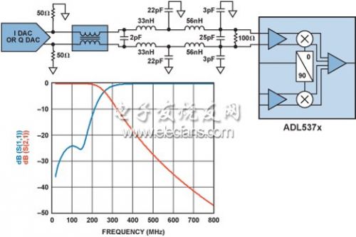 ADL5372的輸入電路需要0.5 V共模電壓,由流經50 Ω電阻的10 mA直流電流提供。0 mA至20 mA交流電流由兩個50 Ω電阻和一個100 Ω電阻共享。因此調制器輸入的交流電壓為20 mA × ((50 × 2) || 100) = 1 V p-p。TxDAC與調制器之間的濾波器用于去除高頻雜散和諧波成分。濾波器的輸入和輸出阻抗為100 Ω。完整接口如圖6所示。