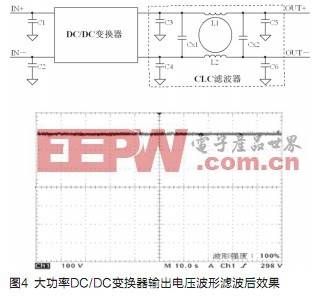 在FCEV用大功率DC/DC變換器中,輸出電壓或電流紋波是電源的重要指標。圖4在大功率DC/DC變換器的輸出端連接CLC濾波器后,變換器輸出電壓波形平穩(wěn),開關噪音減小,濾波效果十分明顯。