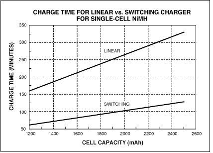 圖6. 對(duì)單節(jié)NiMH電池充電時(shí),線性充電器和開關(guān)充電器的充電時(shí)間不同