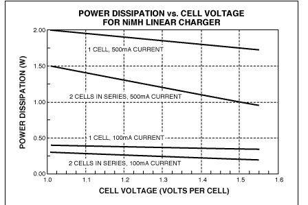 圖5. 采用5.0V電壓的USB端口對(duì)NiMH電池充電時(shí),線性調(diào)整器件的功耗[page]