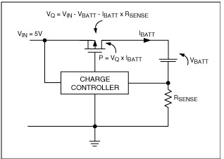 USB 2.0規(guī)范允許低功率端口提供最大100mA電流,大功率端口提供最大500mA電流。如果采用線性調(diào)整器件來調(diào)節(jié)電池充電電流,這也就是最大可提供的充電電流。線性調(diào)整器件(圖4)的功耗為P = VQ x IBATT。這會(huì)造成調(diào)整管發(fā)熱,可能需要安裝散熱器,以防止過熱。