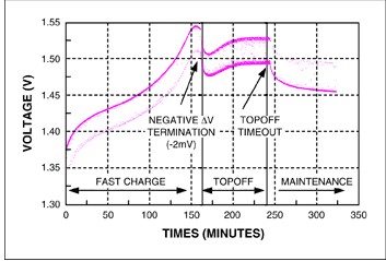 通常采用恒流源對(duì)NiMH電池充電。當(dāng)達(dá)到充滿狀態(tài)時(shí),會(huì)發(fā)生放熱化學(xué)反應(yīng),并導(dǎo)致電池溫度上升,電池端電壓降低。可檢測(cè)電池溫度上升速率或者負(fù)向電壓變化率,并用來終止充電。這些充電終止方法分別稱為dT/dt和-ΔV。充電速率非常低時(shí),dT/dt和-ΔV不太明顯,很難精確檢測(cè)到。電池開始進(jìn)入過充狀態(tài)時(shí),dT/dt和-ΔV響應(yīng)開始顯現(xiàn)。此時(shí)如果繼續(xù)充電,將損壞電池。