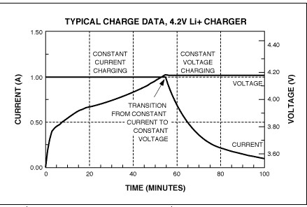 圖2. 使用CCCV充電器對(duì)Li+電池充電時(shí)的典型曲線